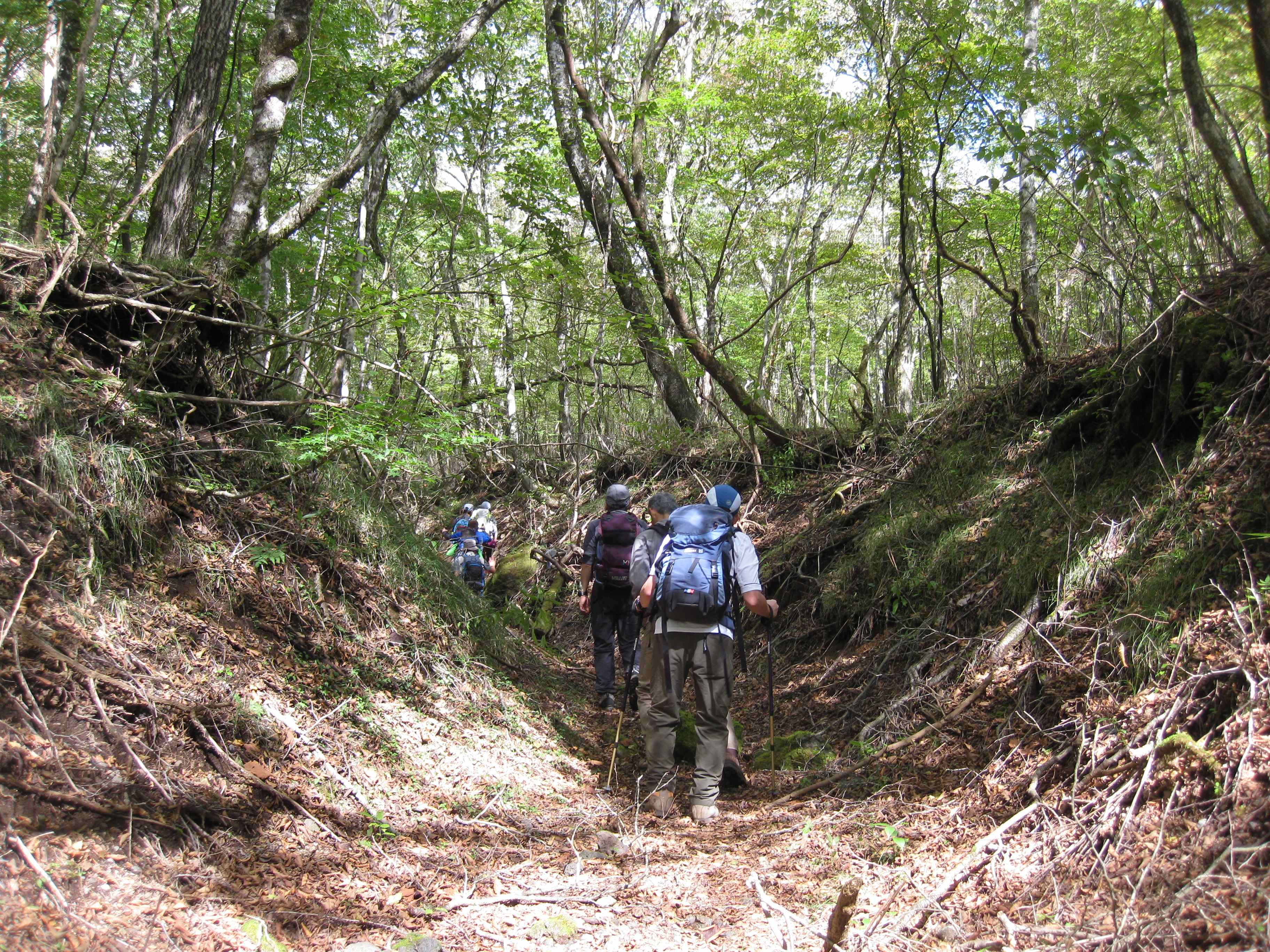 去年の定例山行の「富士山村山古道」は実施出来なかったので、「今年こそ行こう!」と天気の良い中実施できてよかったです。古の人達がこの苔むした道を富士山に向かって歩いたと思うとなんだか胸が熱くなります。登山口から1時間ほど歩いたところの林道(林道富士裾野線)を過ぎた後、違う道に迷い込んでしっまた。浸食して岩が出ている沢路のどこかで右側(東)に渡らなくてはいけなかった思われます。正規ルートに出てからは快適な登りを楽しむことができました。この道は再確認をしたいと思います。次回のスカイラインから6合目までの村山古道も楽しみにしています。