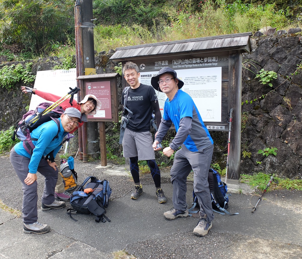 熊野古道第2弾。今回は高野山から来る小辺路コース最終盤の熊野大社までの一日コース。最初の登りは通常の登山並みの一気に1000mアップできつかった!天気は前日の雨もすっきり上がり絶好の登山日和。風は涼しく果無峠では一気に冷え慌ててブレーカーを着ることに。その後はひたすら下り。予定より一時間程度の遅れでしたがまずまずのペースで踏破。道の駅ほんぐうでは一人男性の会話に付き合いやや時間ロス。その後昨年の中辺路コース三軒茶屋跡からのコースを懐かしさを感じつつ熊野大社へ到着。計画より一時間半ほどの遅れでした。宿は川湯温泉。ゆっくり休むことができました。皆さんご苦労様!