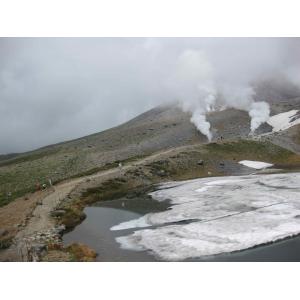 霧雨とガスの中、旭岳山頂に向かう。右手からシュウシュウ?ゴウゴウ?の音が聞こえてくるがガスで真っ白な為何の音か判明しなかった。雪解けで沢の音が聞こえているのかなと思っていた。山頂では一瞬の晴れ間を楽しみ下山。下山中ガスが消え音の正体が判明。沢スジから沢山の噴煙があがっていた。それとともに硫黄の臭いが漂ってき7た。最近、山の火山活動が増えているがこの旭岳も注意が必要なんだろうなと感じた。ロープウェイ駅のまわりの姿見の池では沢山の高山植物を楽しむことが出来た。