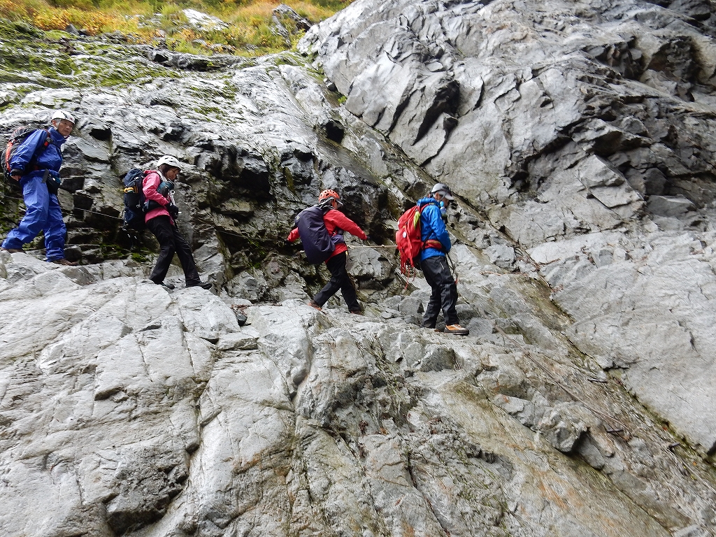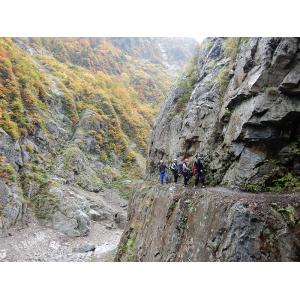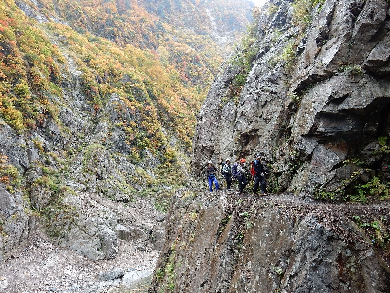 小屋の情報で事故多発とのことで不安のなか、さらに雨模様!しかし、すばらしい紅葉と渓谷のなか、左手に番線右手にカメラで写真も撮る余裕もあり楽しむことができました。滝のシャワーやトンネルを通ったりダムの中を通過したりとおもしろい経験ができました。小屋では温泉や美味しいカレーで満足。翌日は快晴の中、冠雪の山々の絶景を眺め、無事歩き通すことができてよかったです。