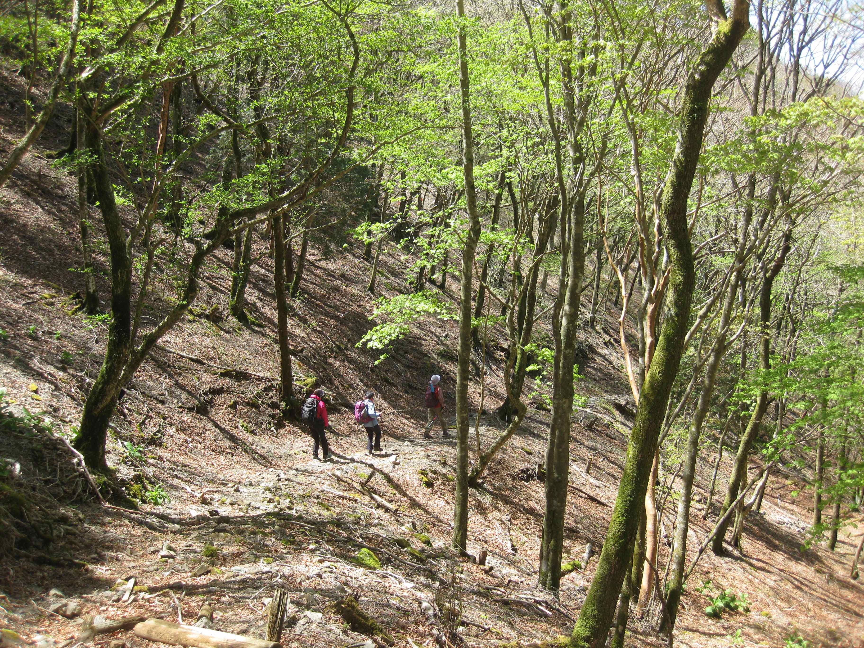 新緑の中、気持ちよく歩くことが出来ました。一昨日の雨の後なので、沢の水量も多く音も大きく聞こえ楽しめました。稜線上は風が強く寒い位でしたが、風が来ない陽だまりは暖かでした。トレーニングの山『竜頭山』ですが四季それぞれ楽しめる山です。