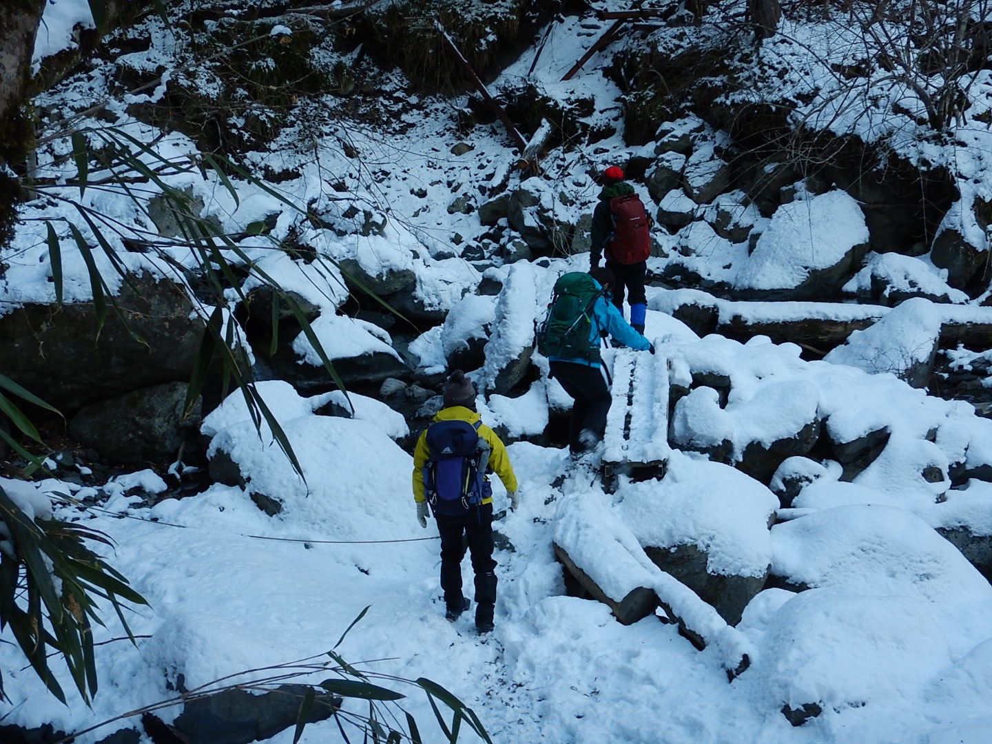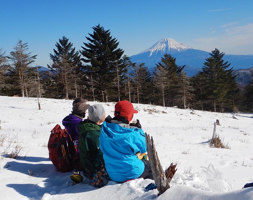 雪道、冬靴の重さ、長い急登、ザラザラの細尾根、キツイ山行も山頂からの景色で報われました。予想外にお天気が良く青空に映える富士山、南アは最高でした。ありがとうございました。