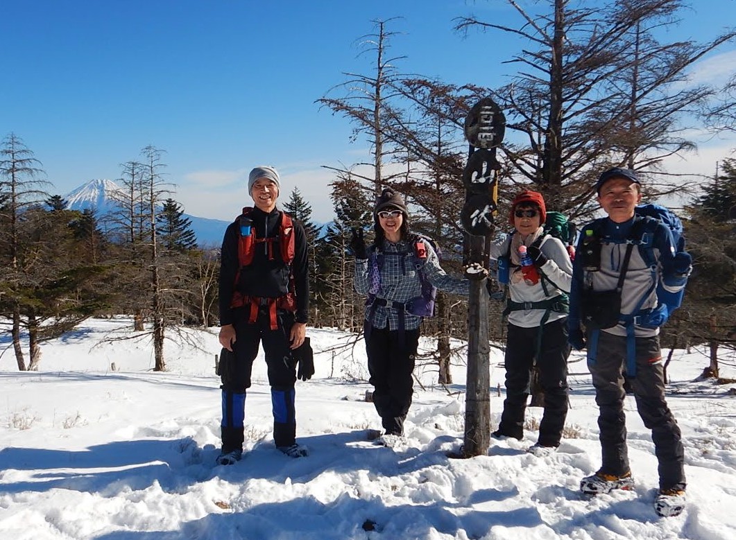 予報で寒さと強風を覚悟していきましたが、風も弱く晴天で日向は暖かく穏やかでした。頂上は雪もあり富士山も、南アルプスの山々もくっきり見へ大満足でした。ただ山は急登が続き雪があり、チェーンスパイクをずっと付けていったのでさすが疲れましたが、新年楽しい山行が出来ました。