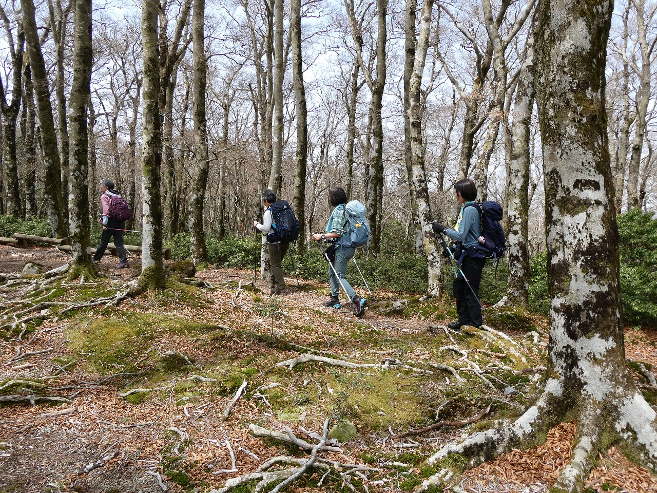 ロングコースでしたが、途中スミレが咲き乱れる道やアセビ、マメザクラ、ブナの原生林は新緑が美しく、ヒメシャラのくねくねしたアートのような古木など気持ちの良い山歩きでした。後半はひたすら歩く感じでしたが、みなさんのおかげで楽しく歩けました。