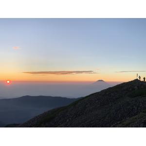 初日は登りで暑く発汗量が多く、両足がつってやっとの事で小屋に着きました。体調心配でしたが、睡眠十分取ったおかげか2日目、3日目はきつかったけど、晴天の中、景色を楽しみながら、順調に気持ちよく歩くことが出来ました。赤石避難小屋の管理人さんは本年度代わりましたけど、話し好きで親切な人でした。ただ今年度酒類の販売は無く残念でした。富士山はずっと見ることが出来ましたが、避難小屋でのご来光と富士山のコラボは最高でした。