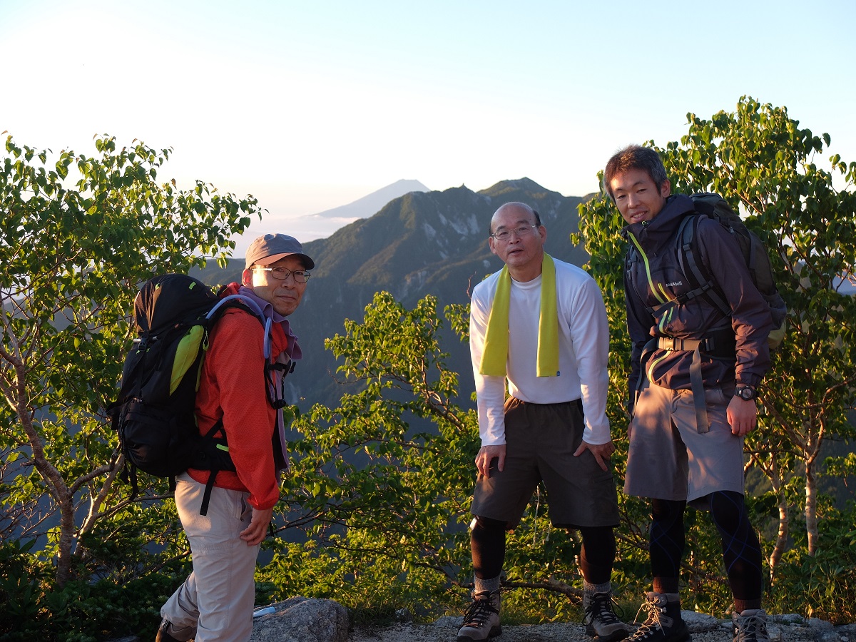初日かなりばててしまい運動不足を痛感しました。黒戸尾根の七丈小屋までは樹林帯を歩くためほとんど山並みを見ることはできません。この日はガスが多くあまり天候はよくありませんでしたが結果オーライでした。小屋の主はネット上に紹介されているとおり曲者でした。詳細は定例会で。翌日は長丁場の八丁尾根トライです。天気は打って変わってほぼ快晴。甲斐駒手前での見事な日の出、山頂での360度の展望。穂高連峰、乗鞍、御嶽、中央アルプス、八ヶ岳、そして富士山、さらに南アルプスの展望、なかなかここまで澄み切った全貌がみられるのは珍しいとただ感激。ところがここからが大変。長かった、厳しかった、疲れた…道は整備されているのに。このへんも定例会で。全般的に疲労が激しかったが思い出に残る良い山行がメンバーのおかげでできました。お疲れさまでした。ありがとうございました。