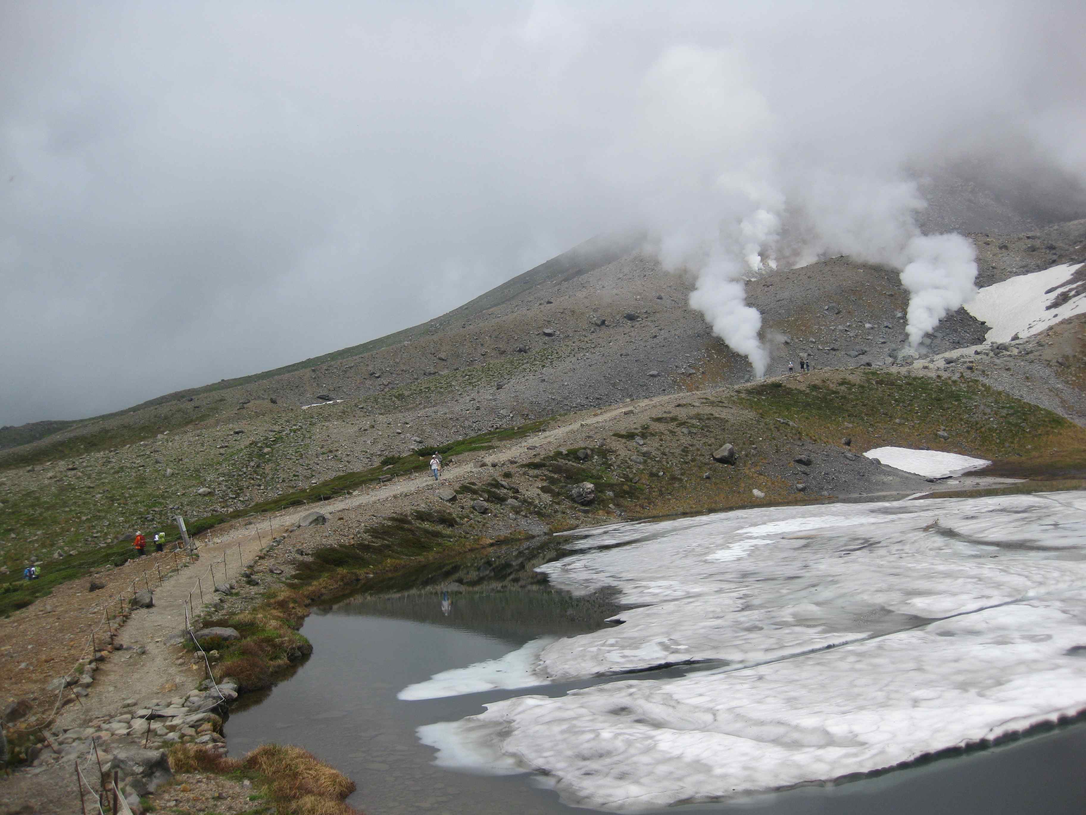 霧雨とガスの中、旭岳山頂に向かう。右手からシュウシュウ?ゴウゴウ?の音が聞こえてくるがガスで真っ白な為何の音か判明しなかった。雪解けで沢の音が聞こえているのかなと思っていた。山頂では一瞬の晴れ間を楽しみ下山。下山中ガスが消え音の正体が判明。沢スジから沢山の噴煙があがっていた。それとともに硫黄の臭いが漂ってき7た。最近、山の火山活動が増えているがこの旭岳も注意が必要なんだろうなと感じた。ロープウェイ駅のまわりの姿見の池では沢山の高山植物を楽しむことが出来た。
