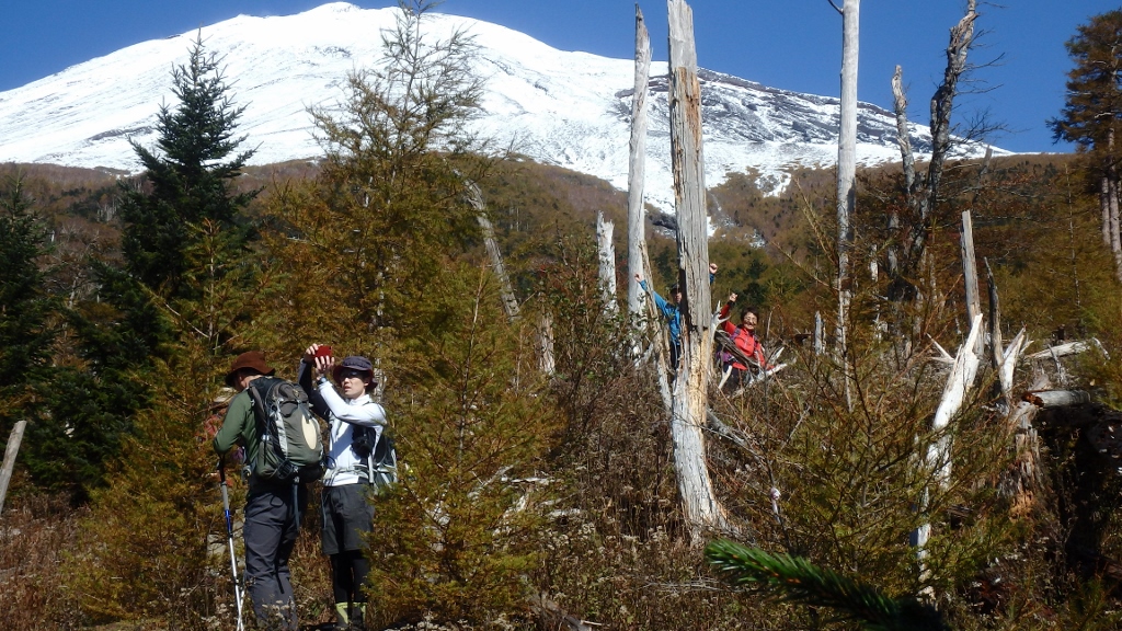 真っ白な富士山と青空、ナナカマドの赤がとても印象的でした。雪が積もり計画通りには歩けませんでしたが、紅葉も始まり秋を感じながらのよい山行となりました。皆さんお疲れ様でした。