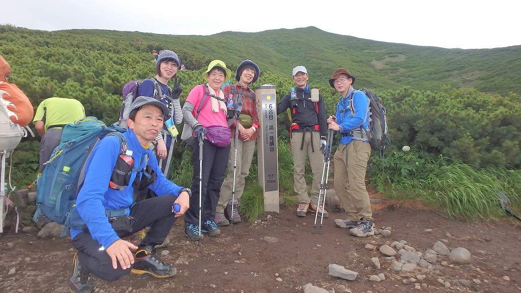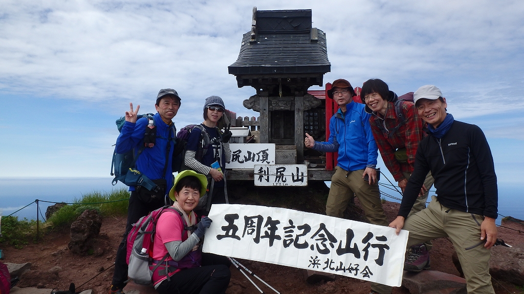 北海道は厚く雲に覆われていた。利尻島に向かう機内では、「着陸できないかもしれません」というパイロットのアナウンス・・・。なんとか上陸したものの、山の姿はほとんで見えなかった。「利尻山を一目見たい。山頂に着いたら一瞬でもいいから海を見たい」とささやかな希望を抱いて当日を迎えた。そうしたら、思いがけず青空が出て、360度の展望に恵まれる登山となった。険しい登り、長くて苦しい下りも、景色に励まされて歩くことができた。ただ、水分を少なめに持ったのは大失敗だった。1.5リットルの予定を、直前に1リットルに減らしてしまい、後半こたえた(案内板は2L以上持参を推奨)。次回への反省点としたい。 みなさん、本当にありがとうございました。
