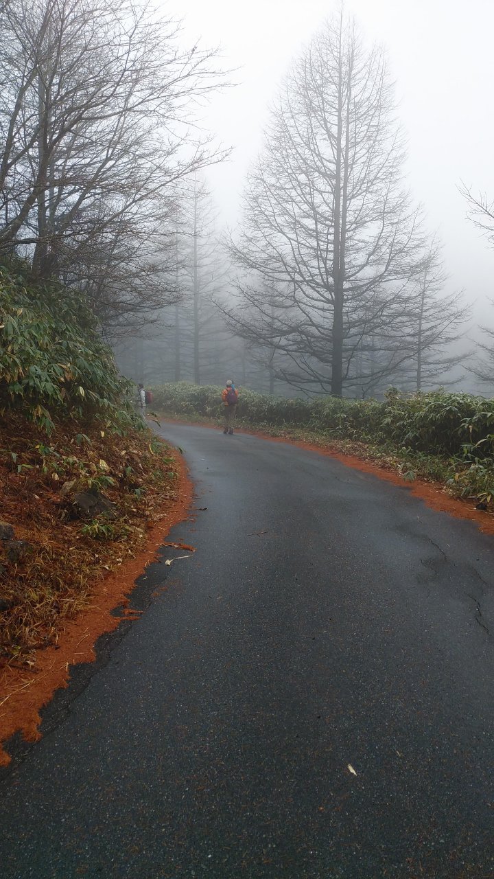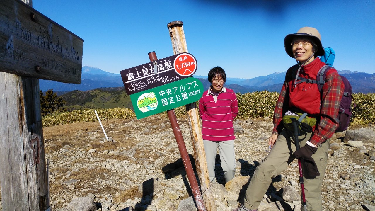 駐車場に着いた時から雲行きが怪しく、歩き始めはガスの中。ところが途中から真っ青な快晴になりホットする。富士見台山頂は風が強くのんびり出来なかったが、360度の大パノラマを楽しむことができた。紅葉はすでに終わっていたが、カラ松の紅葉の時期は素晴らしいだろうなと感じながら楽しく歩くことが出来た。