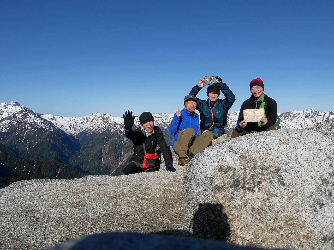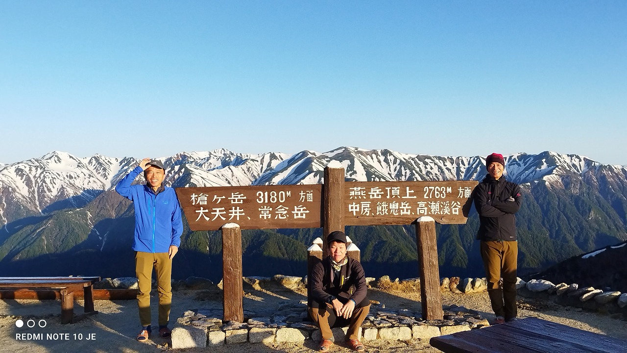 久々の燕岳、小雨予報の中、しっかりと雨で雪見ベンチあたりから残雪がちらほらと合戦小屋から上はしっかりと雪がありました。燕山荘までは冷たい中大変でしたが、夕方より晴れてきて山々が見え安堵しました。翌日は快晴の素晴らしい景色を拝むことが、でき登った甲斐がありました。本当に皆さんお疲れさまでした。