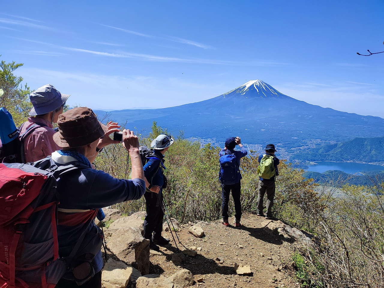 新緑のトンネルと時より見える富士山と湖の景色と参加者の笑顔の素晴らしい山行でした。